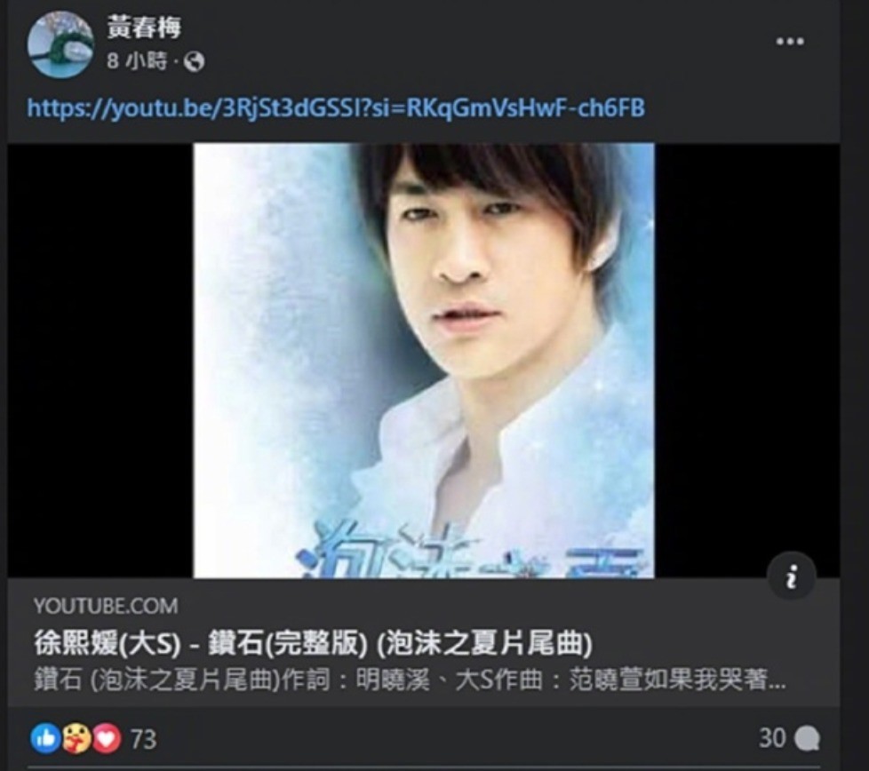 3月1日,据台媒,今日凌晨,S妈再度发文,写道:“他是骗子-我是傻”,并分享了大S为电视剧《泡沫之夏》所演唱的原声带歌曲《钻石》。此举让不少网友疑似在为女儿抱不平。
